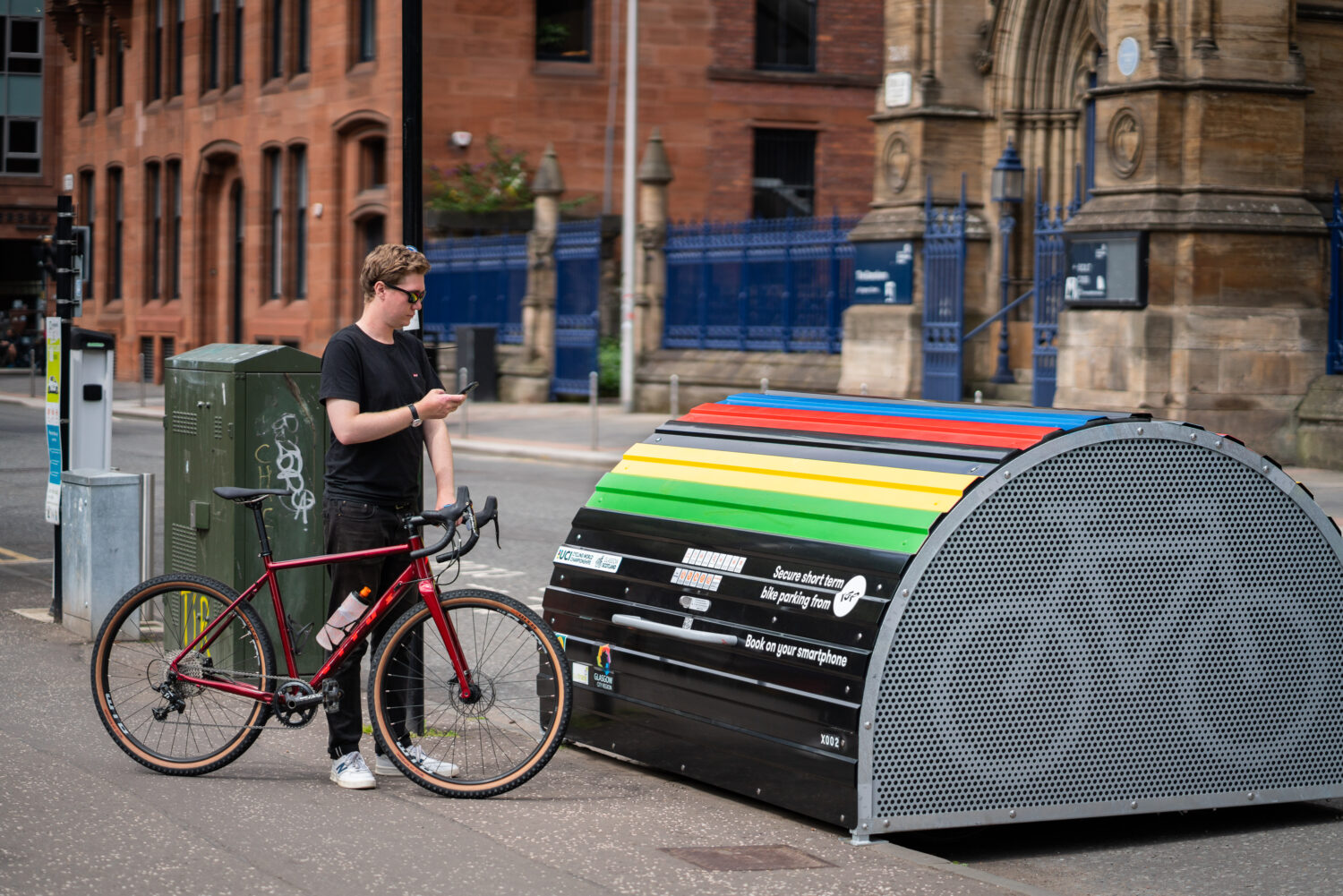 As part of the Glasgow Avenues Programme, Cyclehoop installed a network of 20 Trips Bikehangars at strategic locations across the city centre. With six fully secure, weatherproof cycle parking spaces at each location members of the public can make use of the new cycle routes safe in the knowledge that their bikes are stored securely at their destination. Customers access the Bikehangars through a smartphone app and their parked bikes protected from opportunistic thieves.