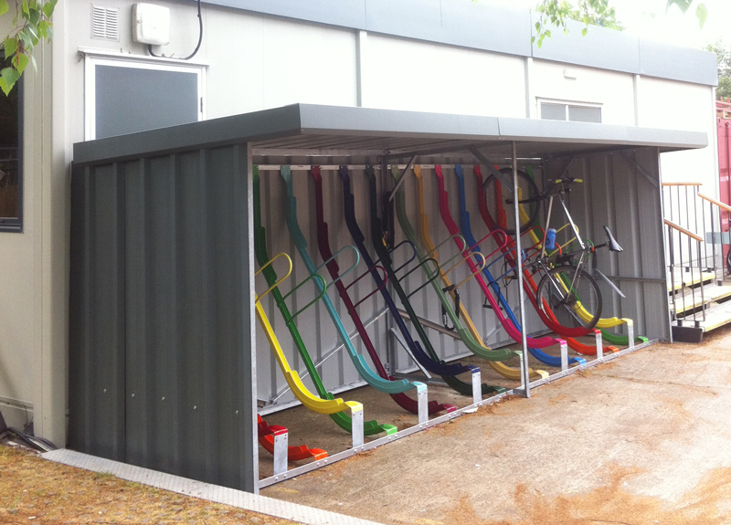 To achieve an aesthetically pleasing design, Cyclehoop made some adaptions to the original Elwells semi vertical bike shelter to create a less industrial look. This involved adding flashing to the front edge of the shelter to hide the corrugation and giving it a Gullwing gray finish.