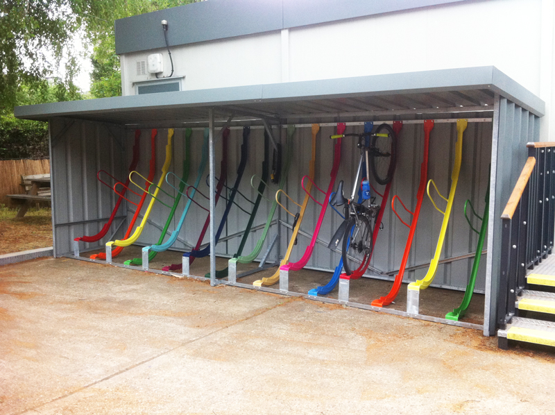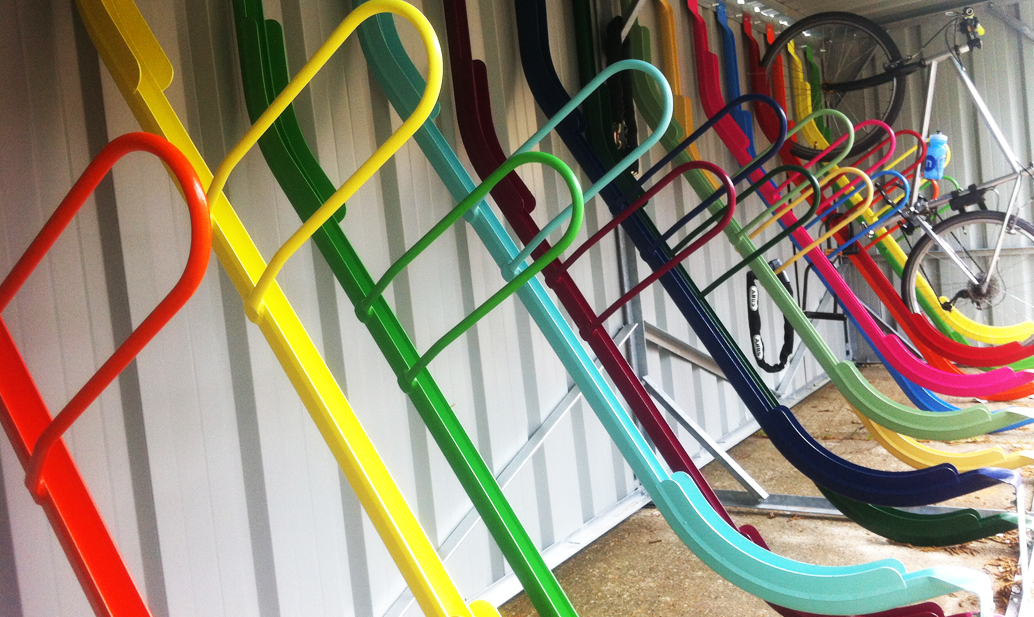 Cyclehoop have recently designed and installed a bike shelter at Brompton’s head office in London, which features multi-coloured bike racks.