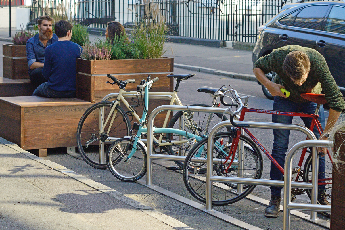 Commissioned by Hackney Council, this project was inspired by our successful Car Bike Port and resonates similar ideas of making new cycling infrastructure that re-uses road space, or space currently used predominately by cars. We wanted to develop this product into something that would encourage public use, as well as cycle parking, something that was green, diverse and blended into the local area.