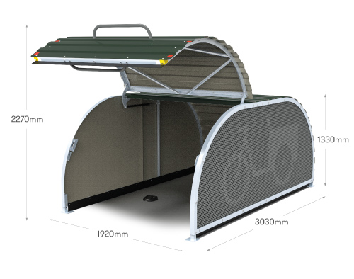 The Cargo Bikehangar is supplied with RAL6009 green powder-coated roof sheets, internal racking and key access as standard. Nine keys are supplied. If you would like any customisations, including custom coloured roof sheets or electronic access, please contact us.
