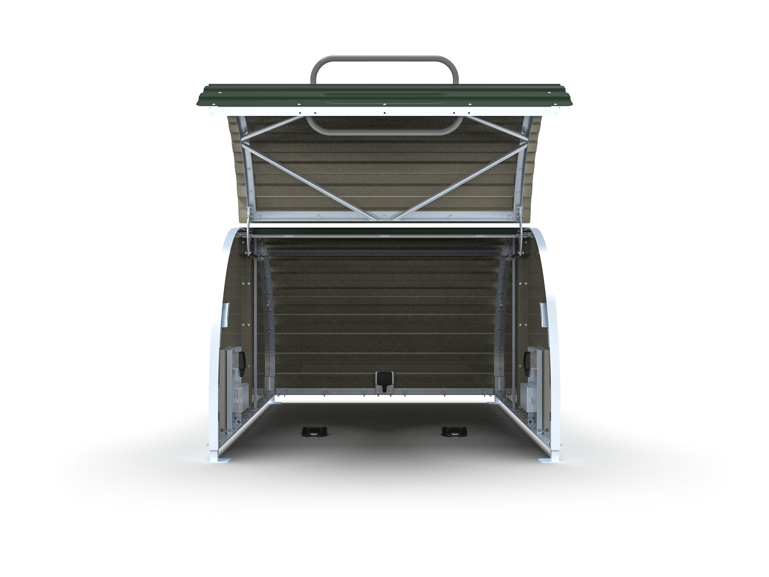 The Cargo Bikehangar is supplied with RAL6009 green powder-coated roof sheets, internal racking and key access as standard. Nine keys are supplied. If you would like any customisations, including custom coloured roof sheets or electronic access, please contact us.