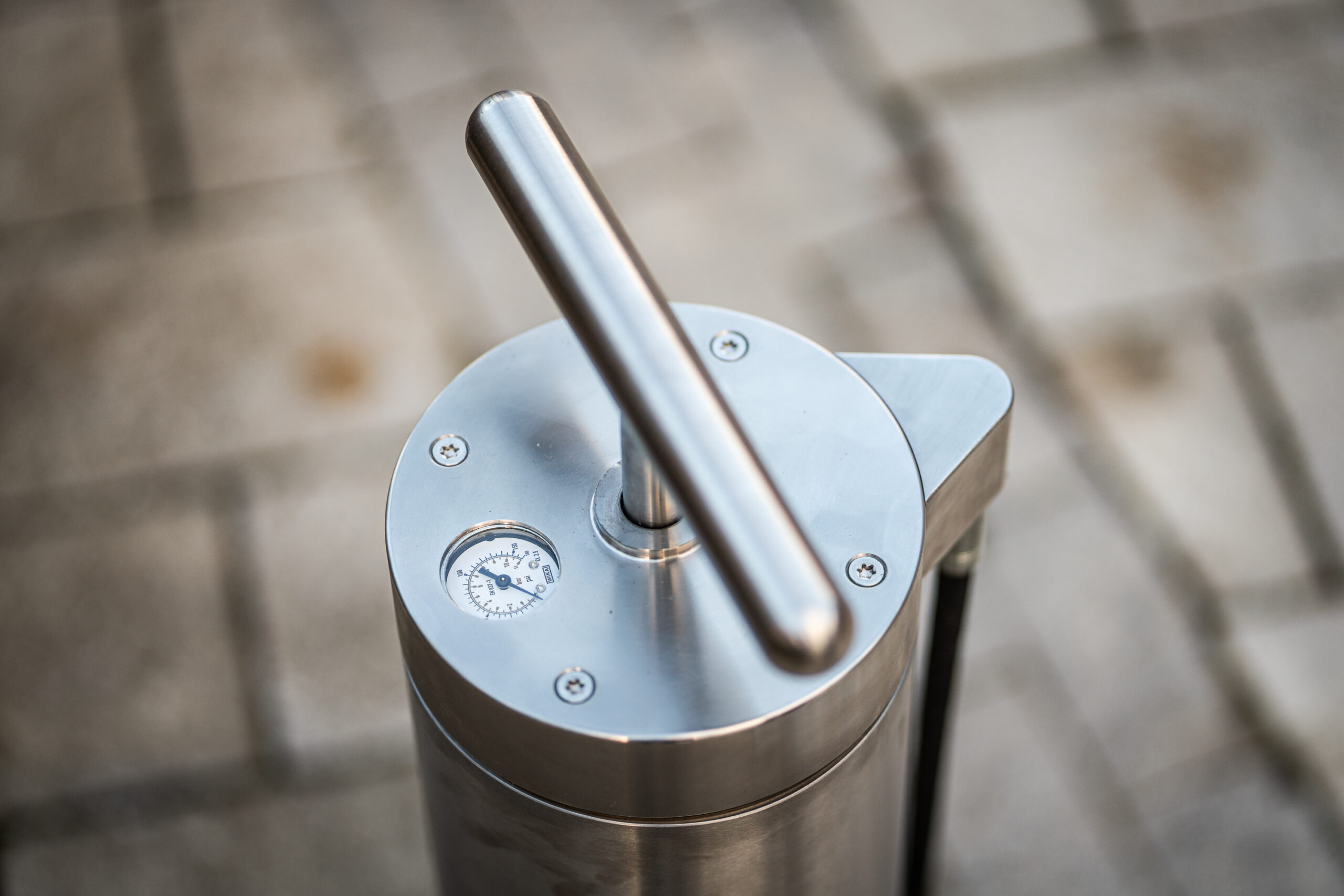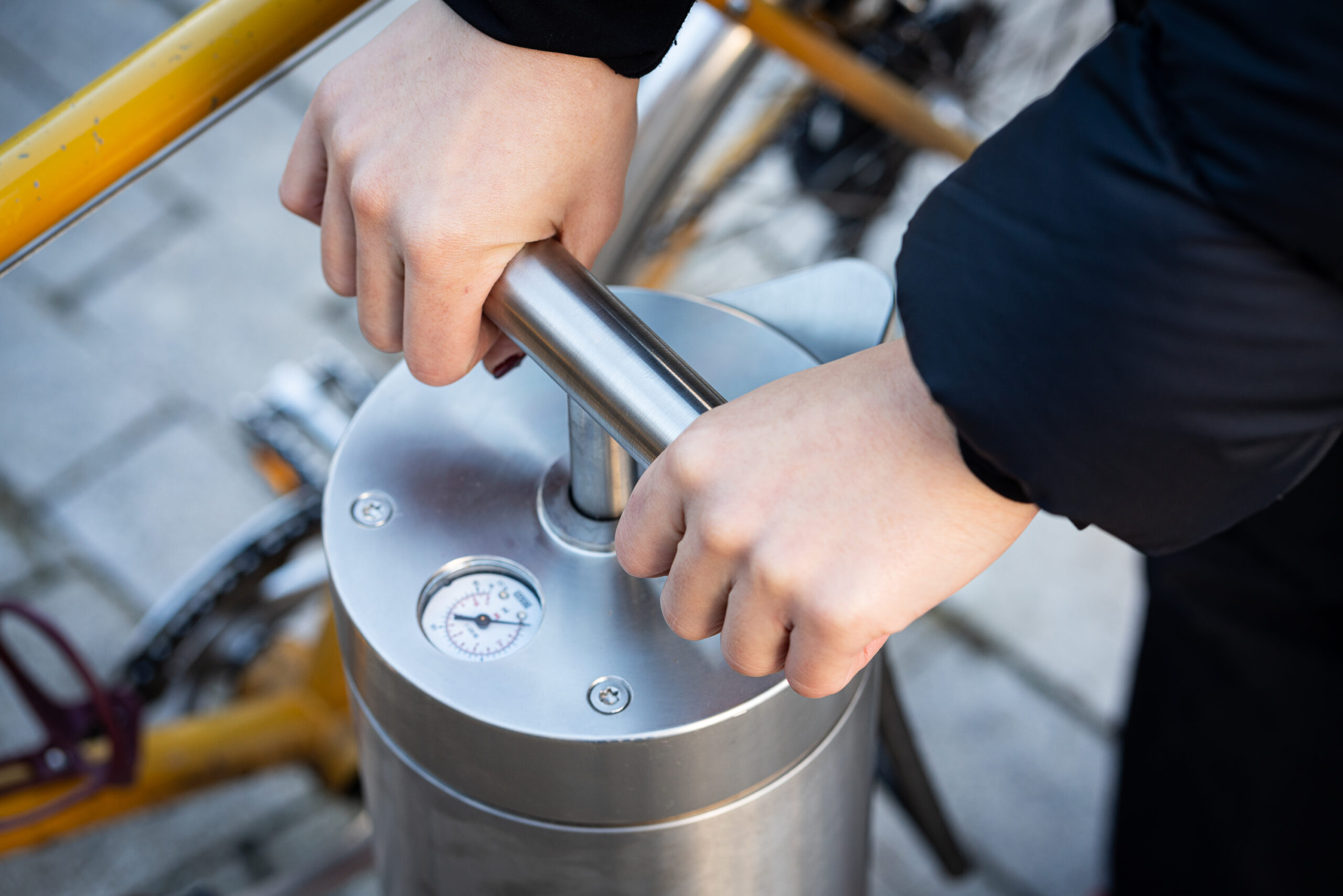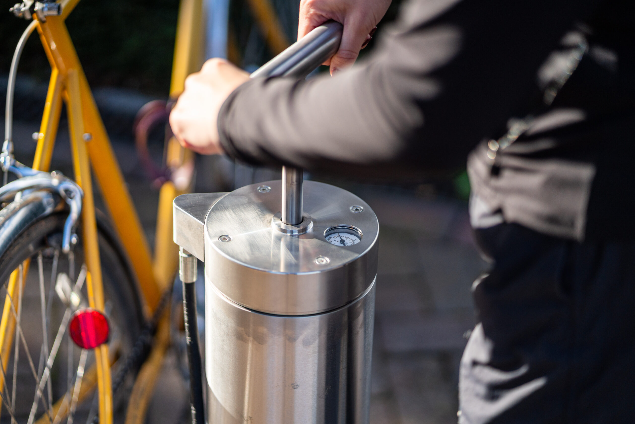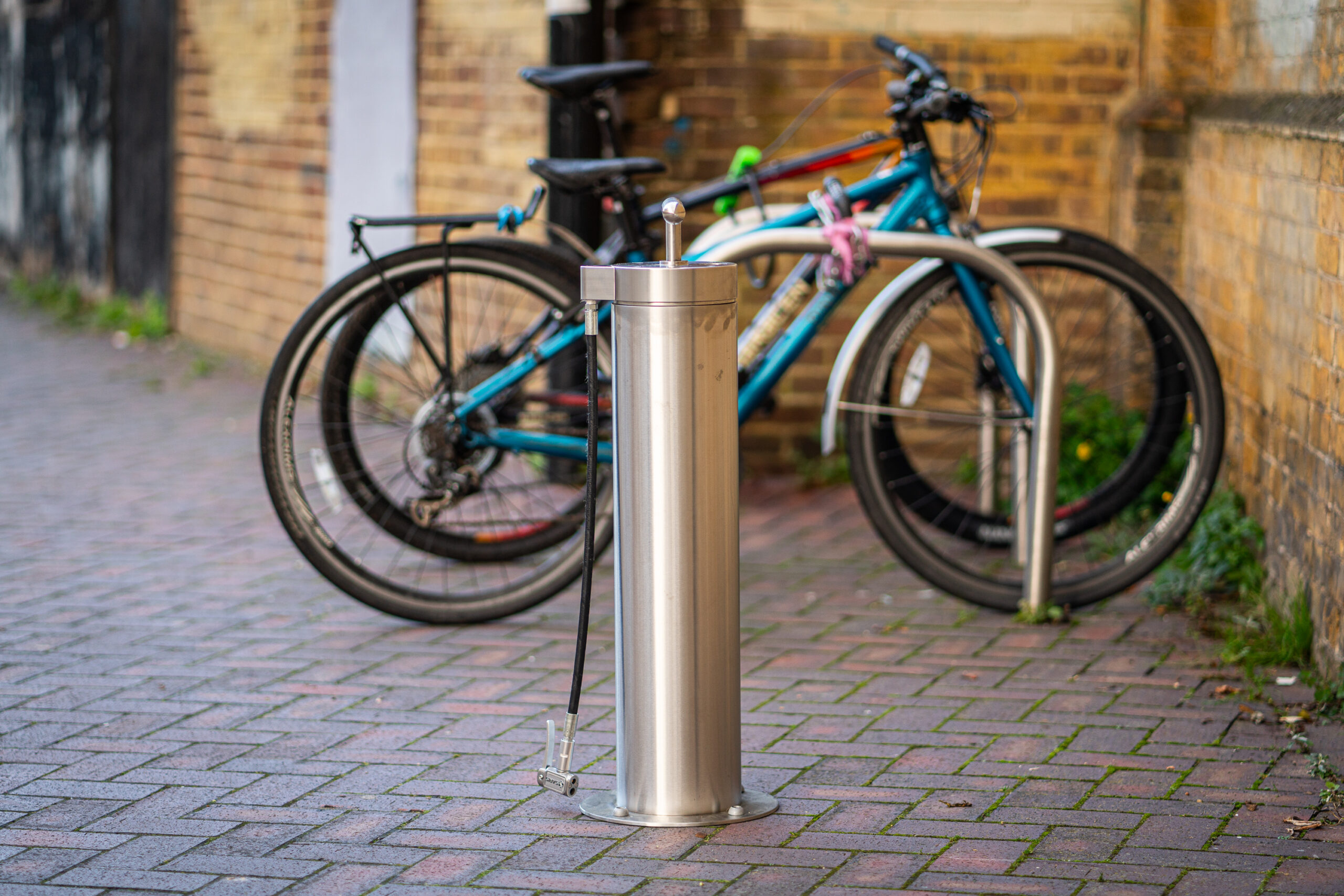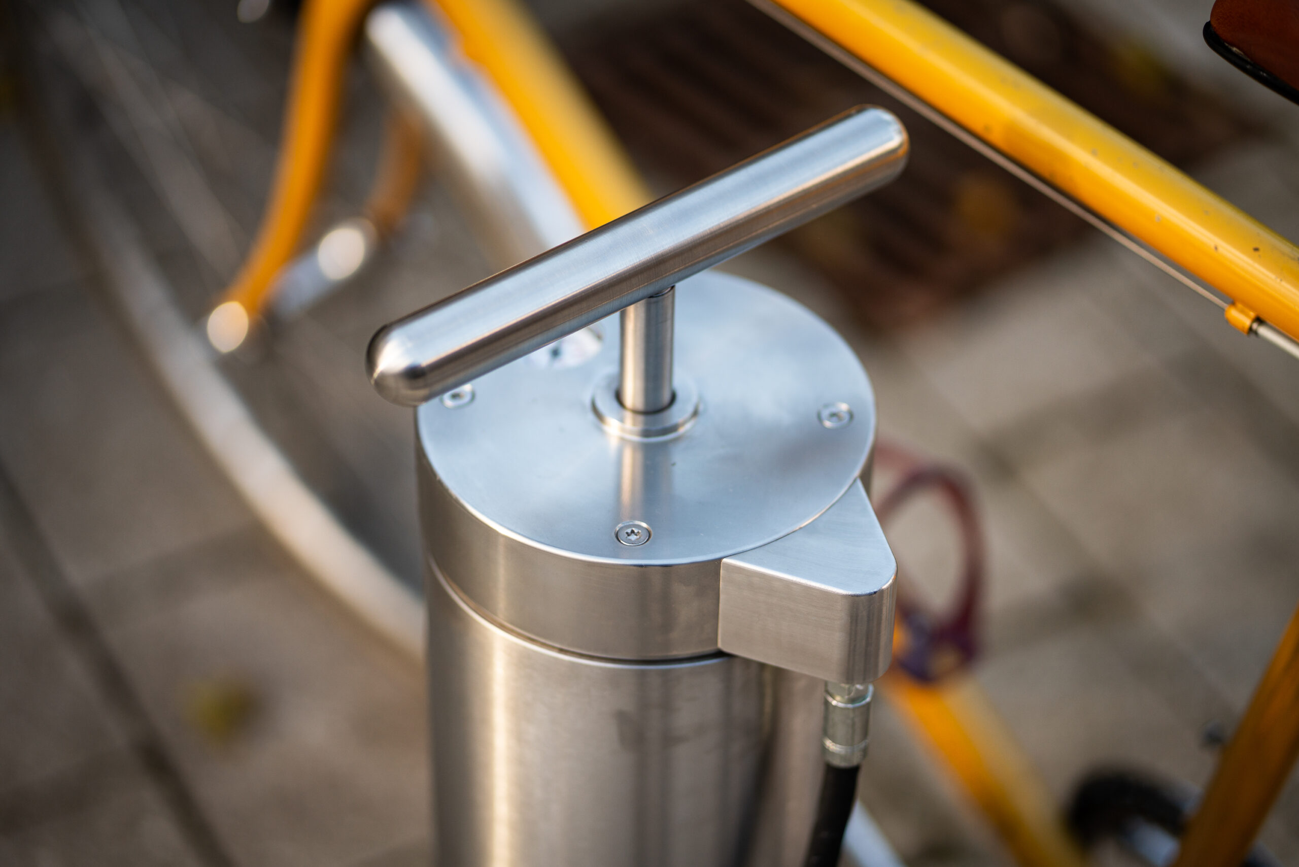 Fixing a puncture or topping up a tyre is one of the most common bike maintenance tasks, but smaller handheld pumps are often slow and difficult to operate. With a vertical arrangement and a long stroke length, the Public Bike Pump makes inflating a tyre quick and easy, at a convenient point in the cycle journey; the perfect way to support and encourage cycling.