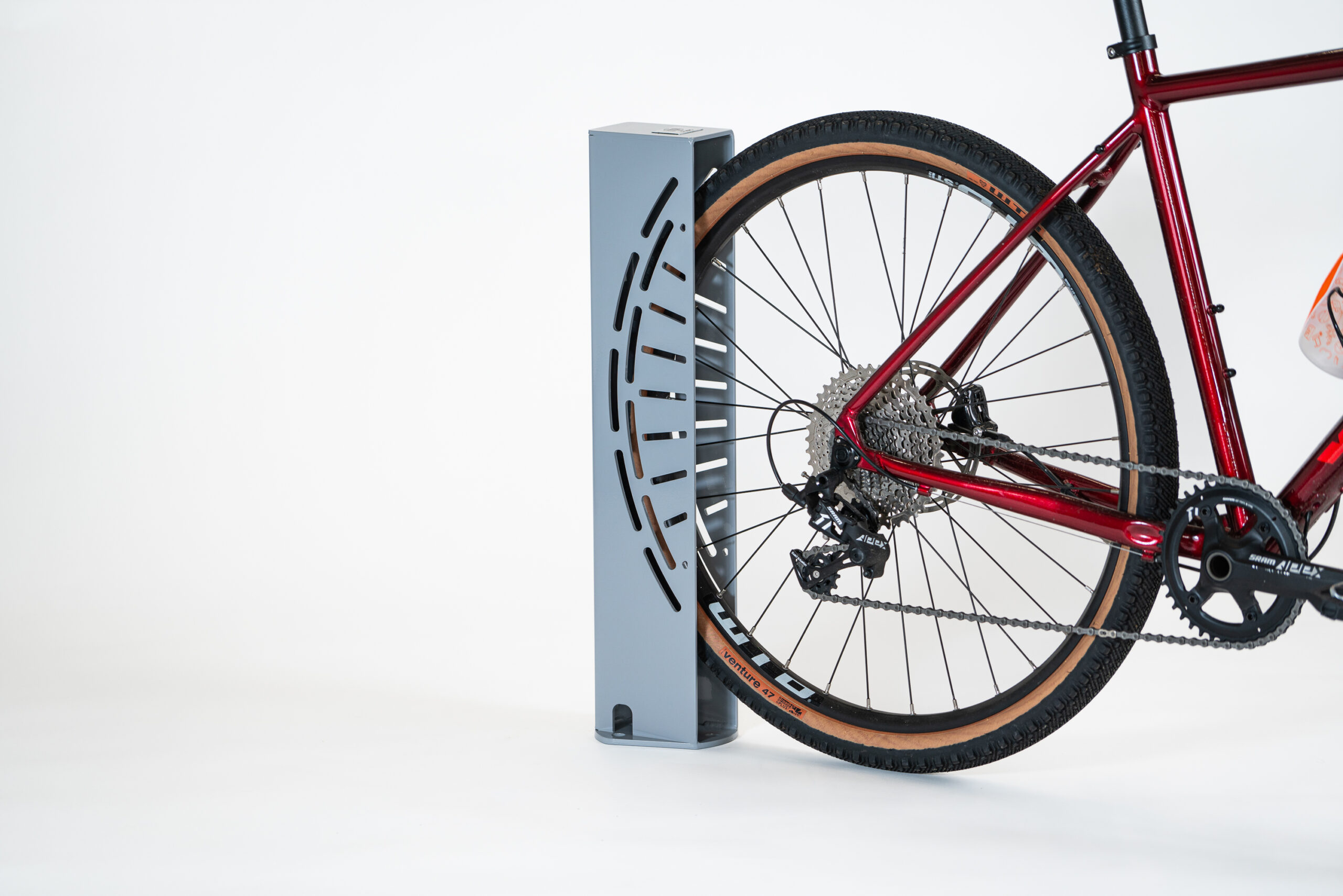 A durable powder coat protects against corrosion and a laser cut bike wheel motif adds texture and visual interest. The wheel holder can be powder coated in any RAL colour to match your brand.