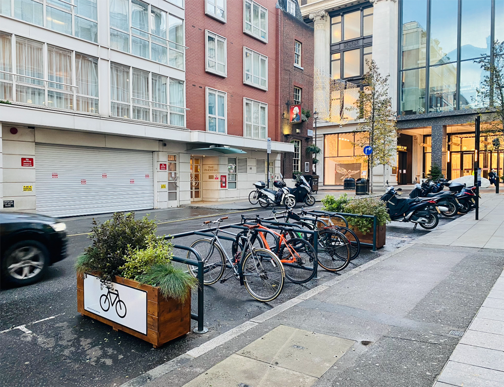 Provision of a cycle parking bay on the carriageway – often referred to as a ‘buildout’ – would usually require three days of disruptive street works to install. The end result is expensive and inflexible to the dynamic mobility requirements of cities and towns.
